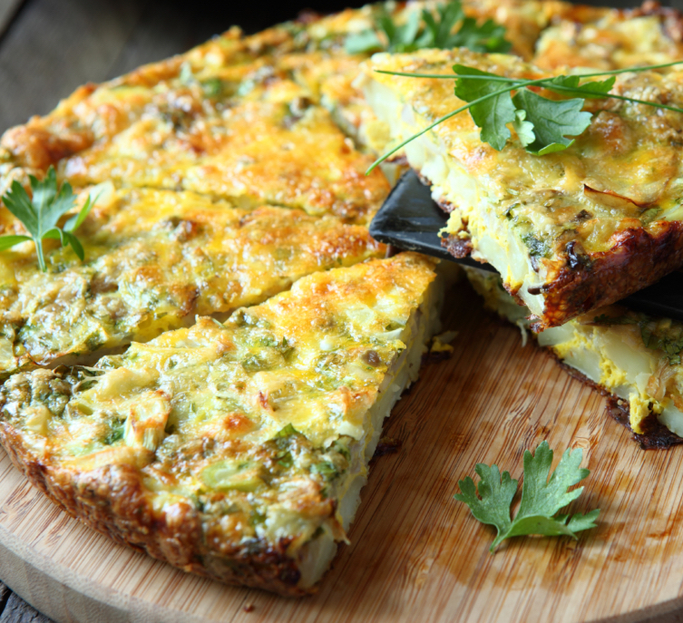- Farmers Kitchen Sink Frittata with Ham, Sausage, Bacon, Potatoes, Onions, topped with Sharp Cheddar Cheese and Spring Onions
